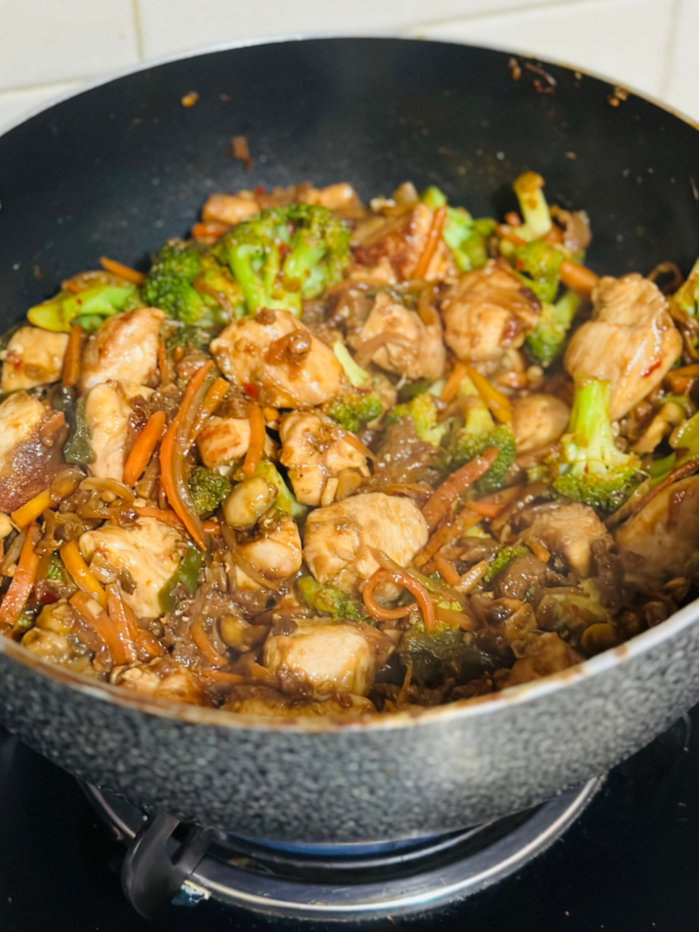 LOADED CHICKEN BULGOGI BOWL Ingredients (makes 1 large/2 medium servings) Boneless Thighs or firm Tofu 100gms Sliced Mushroom 50gms Sliced Carrot 50gms Sliced Onion 1/2 Soya Sauce 2tsp Buy On Apps Get It Apps Now Easy Order Food Play Store Apps Store CHILLI CHICKEN AND VEG 410 KCal with 51 g of Protein 410 KCal with 51 g of Protein List of Ingredients Ingredients(serves 1 hungry person or 2 moderately hungry people! – 410 Kcal with 51 G protein for this whole thing) Chicken marination Boneless chicken breast cubed 200 g onion powder 1 tsp baking powder 1 tsp garlic powder 1 tsp arrowroot flour 1 tbsp egg white 1 soy sauce 1 tsp Salt to taste – olive oil 1.5 tsp For the Sauce Green apple or Pear 1/2 Ginger 1/3rd piece Garlic 4-5 cloves Gochujang 1.5 tsp Brown Sugar 1 tsp Salt To Taste Cooked Rice/Quinoa/Mix of both 80gms Kewpie Mayo 1 tsp Chilli Oil 1 tsp Cucumber Sliced 1 Small Sunny side up Soft Boiled Egg 1 Egg 410 KCal with 51 g of Protein List of Ingredients Ingredients(serves 1 hungry person or 2 moderately hungry people! – 410 Kcal with 51 G protein for this whole thing) Chicken marination 200g Boneless chicken breast cubed 1 tsp onion powder 1 tsp garlic powder 1 tsp arrowroot flour 1 egg white 1tsp soy sauce Salt to taste 1.5 tsp olive oil For the veg 1 tsp olive oil 1 tsp chopped ginger 2 tsp chopped garlic 1 medium onion slices 3-4 slit green chill 1 large broccoli cut into florets 50g cubed mushroom 50g sliced carrot (can also add bell pepper) 1 tsp soy sauce 1 tsp oyster sauce 1/2 tsp white vinegar 1 tsp ketchup mixed with 1 tbsp tomato purée 2 tsp chilli flakes 1/2 a stock cube (optional) 1 tsp brown sugar Salt and water as required Method Method: Sauté ginger, garlic in olive oil until golden brown Add in sliced onion, chilli, mixed veg and sauté for a bit Add in the soy, oyster sauce, a little salt, and cook until all the veg are half done. Remove from pan and set aside, add in the oil for the chicken into the same pan. Coat the chicken with the arrowroot flour, egg white, soy sauce and listed seasoning powders and fry until brown. Add back the mixed veg, ketchup, tomato purée, vinegar, stock cube, salt and sugar and sauté on high heat for a few minutes. Serve HOT! ❤️ Ingredients