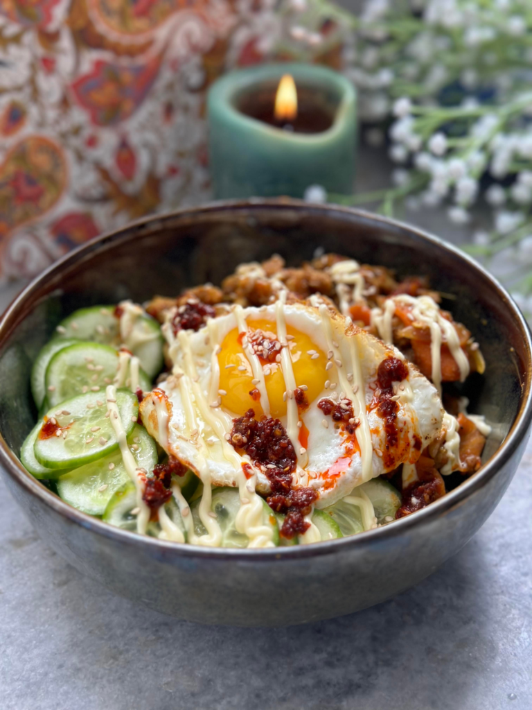 LOADED CHICKEN BULGOGI BOWL 566 KCal with 30 g of Protein List of Ingredients (makes 1 large/2 medium servings) 100 skinless chicken thighs or firm tofu, sliced (I marinated mine with 1 tsp chilli powder, salt and 1 tsp garlic powder and a pinch of turmeric powder) 50 g sliced mushroom 50 g sliced carrot 1/2 an onion sliced 2 tsp soy sauce 1-1.5 tsp cooking oil For the sauce – 1/2 a green apple or pear 1/3rd inch piece of ginger 4-5 cloves of garlic 1.5 tsp Gochujang 1 tsp brown sugar Salt to taste 80 grams cooked rice/quinoa/mix of both 1 tsp kewpie mayo 1 tsp chilli oil 1 small cucumber sliced 1 sunny side up/soft boiled egg Method Method: Blend together all ingredients for the bulgogi sauce Mix it well with the sliced chicken, mushroom, onion and carrots along with the soy sauce. Marinate for 15 mins and cook in a heavy bottom pan with oil until the chicken browns a little and the sauce becomes thick and caramelised. Assemble the bowl with rice/quinoa, the bulgogi chicken and veg, sliced cucumber, fried/boiled egg, kewpie mayo, chilli oil and sesame seeds Put on a Gong Yoo drama and DIG IN! ❤️